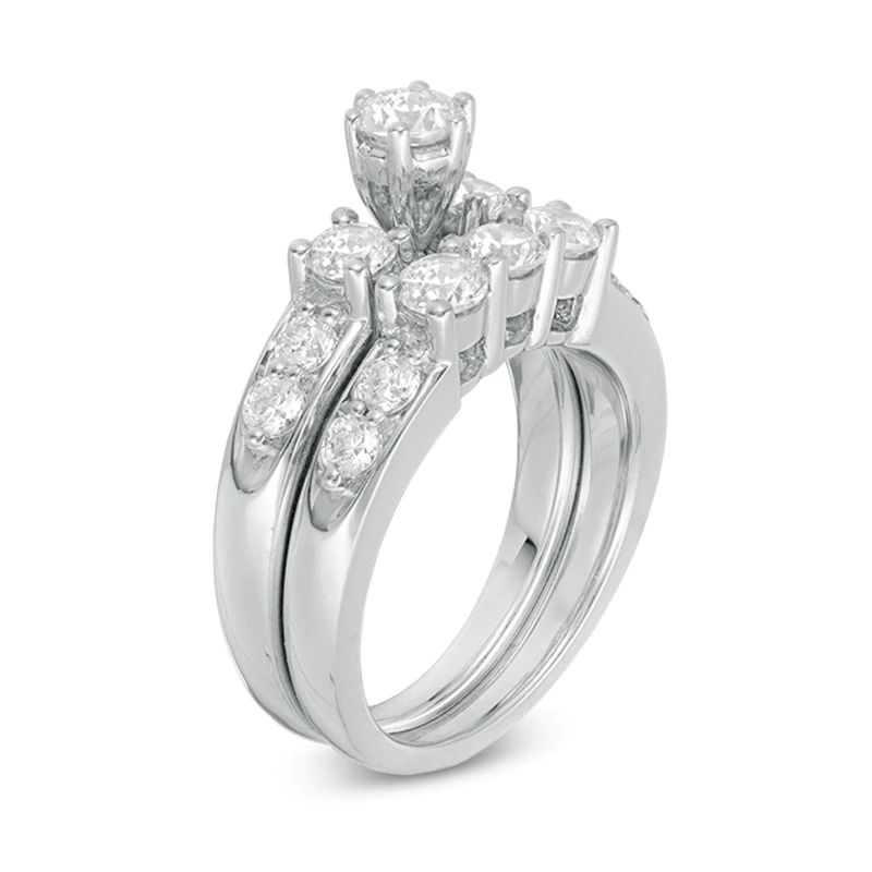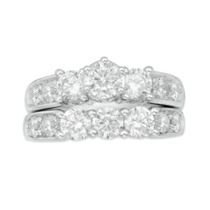 On the day you ask for her hand in marriage, honor her with a three stone diamond bridal set that honours love. Exquisite in 14K white gold, the engagement ring dazzles with three round diamonds as its focus.And two small round diamonds complete the look. On your wedding day, complete the ensemble with the coordinating wedding band, which also features three round diamonds flanked by round stones set into the shank.t.w. of diamonds and a polished shine.